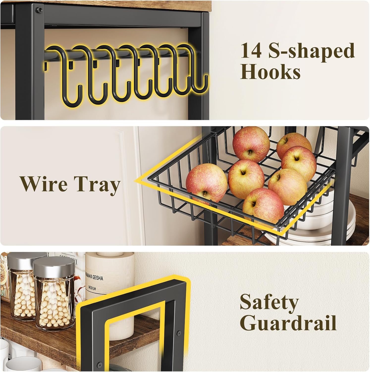 Your safety is a priority. This baker rack includes anti-tip devices to ensure stability and prevent accidents in busy kitchens. Whether you have kids running around or heavy appliances on the shelves, you can trust that this rack will remain secure and upright, offering peace of mind along with its practical benefits.